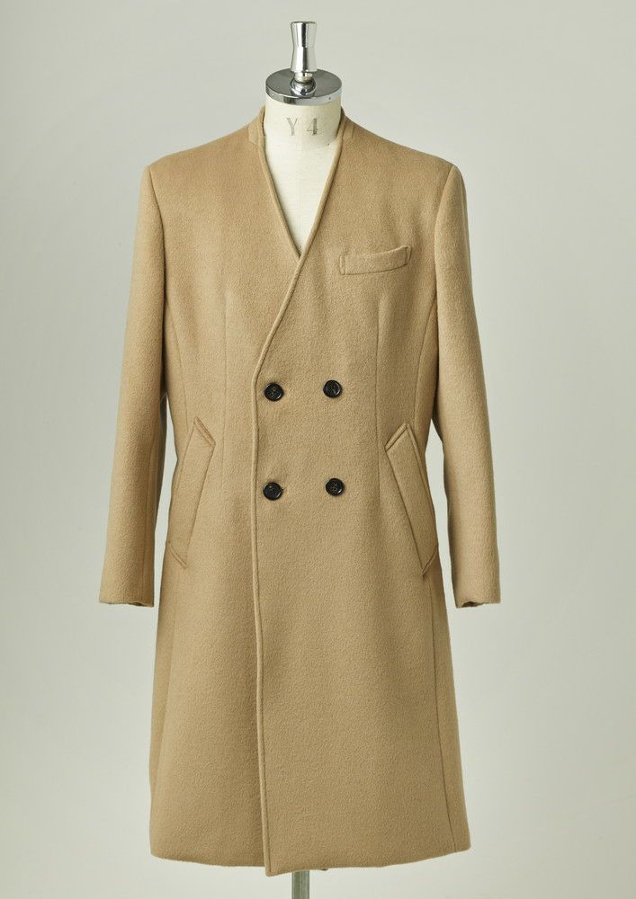 新型のセミダブルノーカラーチェスターコートです。2つボタンのダブル仕立てで、袖口は本切羽仕様。