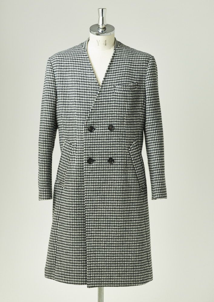 新型のセミダブルノーカラーチェスターコートです。2つボタンのダブル仕立てで、袖口は本切羽仕様。
