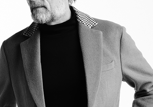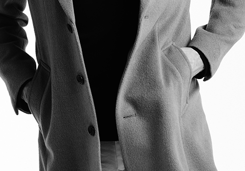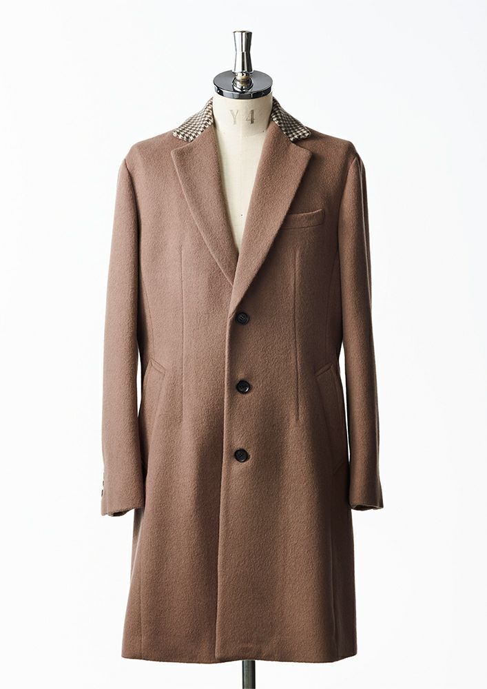 新型のチェスターコートです。3つボタンのシングル仕立てで、袖口は本切羽仕様。腰ポケットは箱ポケットを採用し、AKM独自のタイトフィットパターンが身体のラインを美しく見せます。スーツやセットアップとの相性はもちろん、ニットやカットソーの上に一枚羽織るだけでも大人の風格を醸します。メイン素材が無地の場合は上衿、上衿腰、地衿を千鳥柄の別布使い、メイン素材が千鳥の場合は上衿、上衿腰、地衿、前身返しを無地黒の別布使いし、デザインしています。