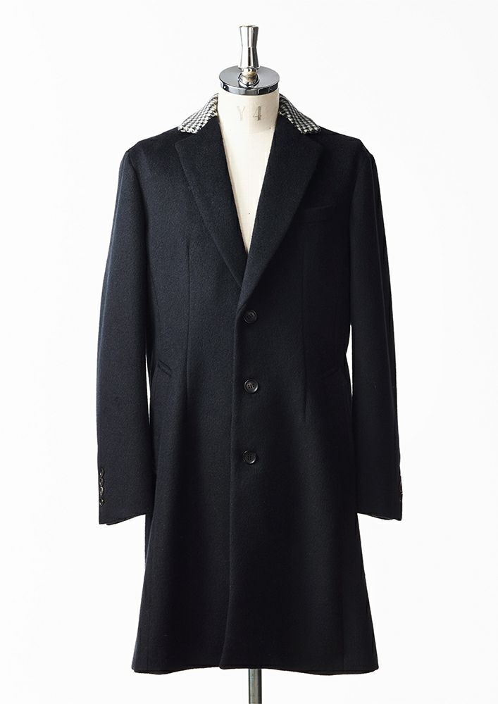 新型のチェスターコートです。3つボタンのシングル仕立てで、袖口は本切羽仕様。腰ポケットは箱ポケットを採用し、AKM独自のタイトフィットパターンが身体のラインを美しく見せます。スーツやセットアップとの相性はもちろん、ニットやカットソーの上に一枚羽織るだけでも大人の風格を醸します。メイン素材が無地の場合は上衿、上衿腰、地衿を千鳥柄の別布使い、メイン素材が千鳥の場合は上衿、上衿腰、地衿、前身返しを無地黒の別布使いし、デザインしています。