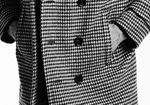 特徴は襟元まで留められる8ボタン仕様(衿のチンストラップは無し)、ハンドウォーマー2ポケットです。本水牛六穴釦を使用。シルエットはウエスト、アームホールを絞ることで見事にモダンな印象、かつ大人の色気を引き出しています。