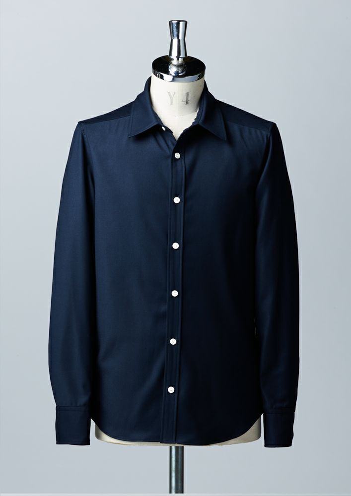 AKM定番のプレーンシャツ。 ドレスシャツを タイトフィッティングに直線的なディテールで構築したベーシックシャツ。今季はレギュラーカラーをご提案します。釦はAKMロゴ入り本水牛シャツ釦を採用。展開カラーは無地4色、コンビ2色の計6色です。