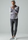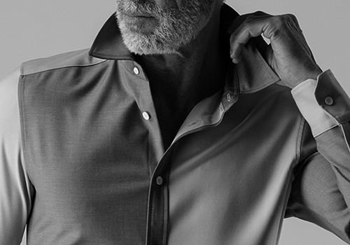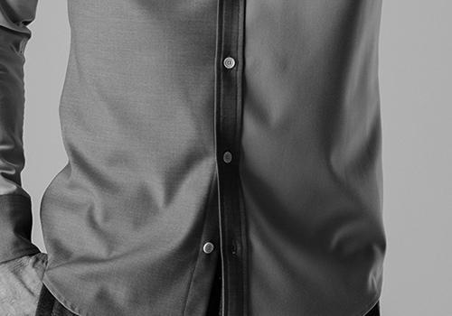 今季はレギュラーカラーをご提案します。釦はAKMロゴ入り本水牛シャツ釦を採用。
