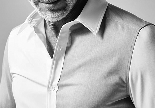AKM定番のプレーンシャツ。 ドレスシャツを タイトフィッティングに直線的なディテールで構築したベーシックシャツ。 衿はやや小ぶりのレギュラーカラーをご提案します。 釦はAKMロゴ入り本水牛シャツ釦を採用。今季は無地4色、クレイジー仕様2色の計6色展開です。