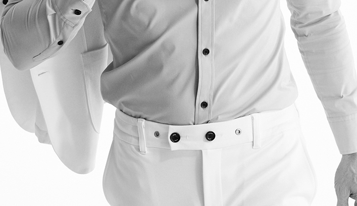 AKM定番のプレーンシャツ。 ドレスシャツを タイトフィッティングに直線的なディテールで構築したベーシックシャツ。