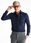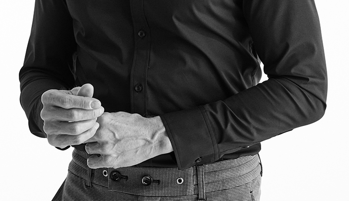 AKM定番のプレーンシャツ。 ドレスシャツを タイトフィッティングに直線的なディテールで構築したベーシックシャツ。