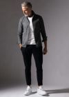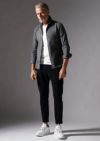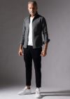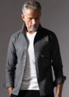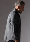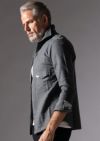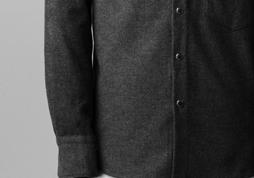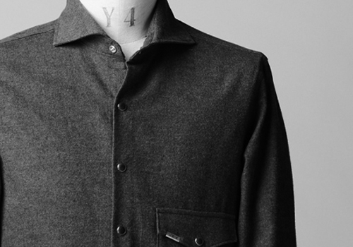 首元の見え方を重視し、襟開きが180度に近く、ややオープンカラー気味に綺麗に開く様に形成しています。そんなドレッシーな仕様でありながら、表地にはフランネル、釦はスナップ釦を採用するなどバランスよくカジュアルダウンしています。また、特徴的なフラップポケットはいわゆる左胸より、わざと下げた位置に配しています。