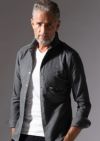 襟先の広がったホリゾンタルカラーを採用したフラップポケット付きのシャツ。