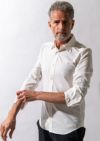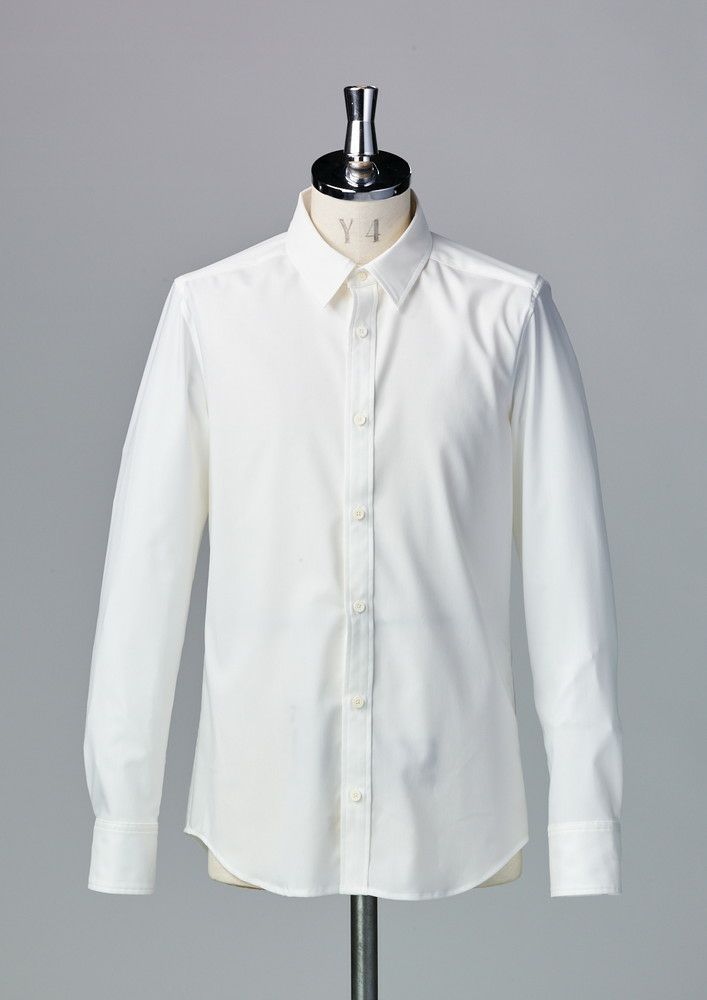 AKM定番のプレーンシャツ。 ドレスシャツを タイトフィッティングに直線的なディテールで構築したベーシックシャツ。今季はレギュラーカラーをご提案します。釦はAKMロゴ入り本水牛シャツ釦を採用。展開カラーは無地4色です。