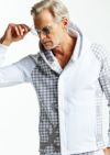 企画が始まって以来ずっと奈良の編み工場にて編み続けているこの生地は、その強力なストレッチのため染色加工の段階でかなりのシワが入ってしまうのを泉州の染色工場が何度も時間をかけて仕上げることでシワを伸ばし生地に仕上げています。 プリントもずっと泉州のプリント工場で加工しており、安定的なクオリティを保証します。今季は無地のホワイト、杢グレー、黒の3色、無地とAKMオリジナル千鳥カモ柄のクレイジー仕様にした2色 計4色展開です。