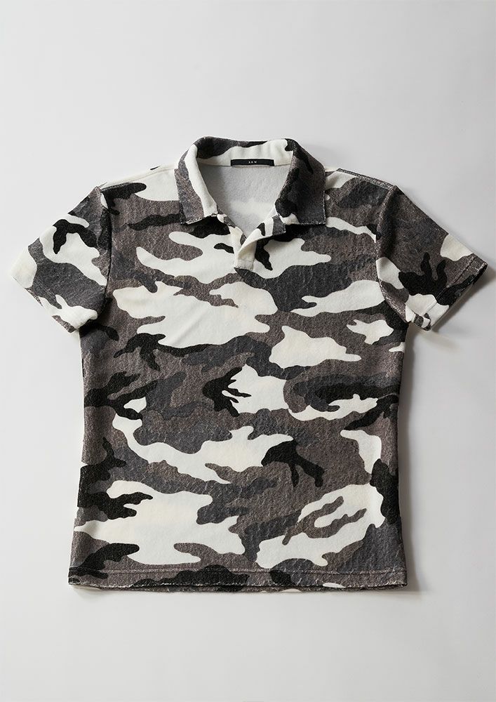 春夏の定番半袖スキッパーポロです。小ぶりのレギュラー衿を採用し、前開きを浅くし、フロント釦を排除することで、シンプルに仕上げています。今季は無地3色、そしてウッドランドカモ柄のシティーカモ1色の計4色展開です。