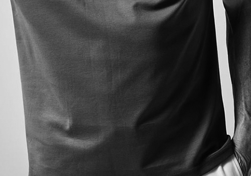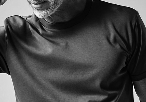 AKM定番のVネックとクルーネックの半袖Tシャツです。シンプルでベーシックなアイテムだからこそ、毎シーズン、身巾や衿の深さ、形状など改良を重ねています。今季は後衿下にAKMロゴをプリントしています。