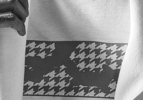 AKM定番の半袖クルーネックTシャツをベースに、今季、多用しているAKMオリジナルの千鳥カモ柄をBOX型に落とし込み、胸中央に大胆にプリントしています。