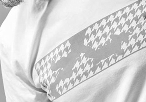 AKM定番の半袖クルーネックTシャツをベースに、今季、多用しているAKMオリジナルの千鳥カモ柄をBOX型に落とし込み、胸中央に大胆にプリントしています。