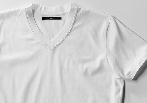 AKM定番ハンドステッチ半袖Tの一重仕様の登場です。今季は定番でありながら、微修正を重ねているVネックを発表します。ネック部分に職人の手によるリメイク(×ステッチ)が施されており 「デザイン性」と機械には出せない「温もり」を醸し出しています。ハンドステッチ用の糸は100%最高級エジプト綿(長繊維)を使用。 製造過程で炎で毛羽を焼かれ、シルケット加工を施されたこの糸は美しい真珠のような光沢を放っています。 素材感とそこに生気を吹き込むべく職人の手による装飾リメイクは単なるTシャツをあらゆる角度から捉え、再構築しています。