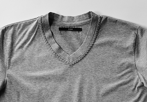 AKM定番ハンドステッチ半袖Tの一重仕様の登場です。今季は定番でありながら、微修正を重ねているVネックを発表します。ネック部分に職人の手によるリメイク(×ステッチ)が施されており 「デザイン性」と機械には出せない「温もり」を醸し出しています。ハンドステッチ用の糸は100%最高級エジプト綿(長繊維)を使用。 製造過程で炎で毛羽を焼かれ、シルケット加工を施されたこの糸は美しい真珠のような光沢を放っています。 素材感とそこに生気を吹き込むべく職人の手による装飾リメイクは単なるTシャツをあらゆる角度から捉え、再構築しています。