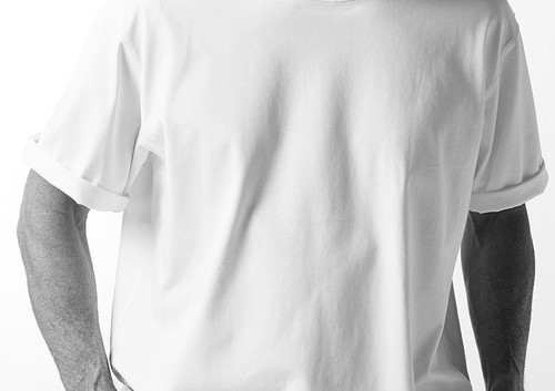 AKM定番の半袖クルーネックTシャツをベースに、袖は五分丈、サイズ感をビッグシルエットにアレンジしています。衿はリブ(フライス)仕様です。