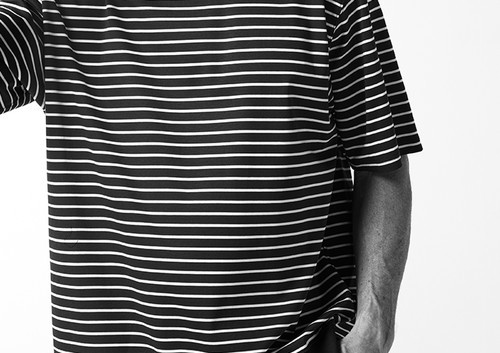 AKM定番の半袖クルーネックTシャツをベースに、袖は五分丈、サイズ感をビッグシルエットにアレンジしています。衿、裾はリブ(フライス)仕様です。