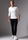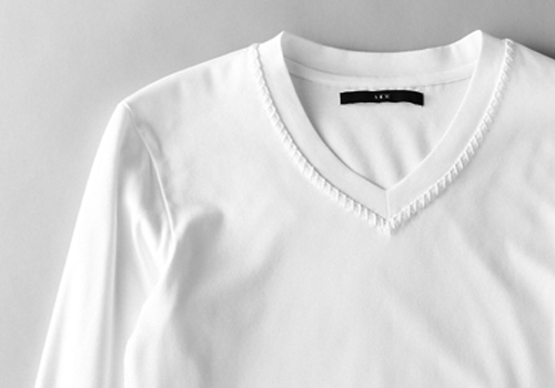 仕様は2枚のTシャツを1枚にした二重構造です。 カットソーの顔とも言えるネック形状は男らしさと上品さを兼ね備えたVネックを採用しています。