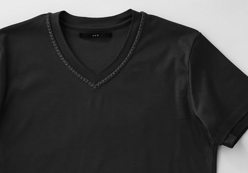 そのVネック部分に職人の手によるリメイク(×ステッチ)が施されており 「デザイン性」と機械には出せない「温もり」を醸し出しています。ハンドステッチ用の糸は 100%最高級エジプト綿(長繊維)を使用。 製造過程で炎で毛羽を焼かれ、シルケット加工を施されたこの糸は美しい真珠のような光沢を放っています。 また、二重構造を活かし、裾と袖口は内側を覗かせています。 素材感、二重構造とそこに生気を吹き込むべく職人の手による装飾リメイクは単なる無地のTシャツをあらゆる角度から捉え、再構築しています。今季は長袖と半袖の2型をご提案します。