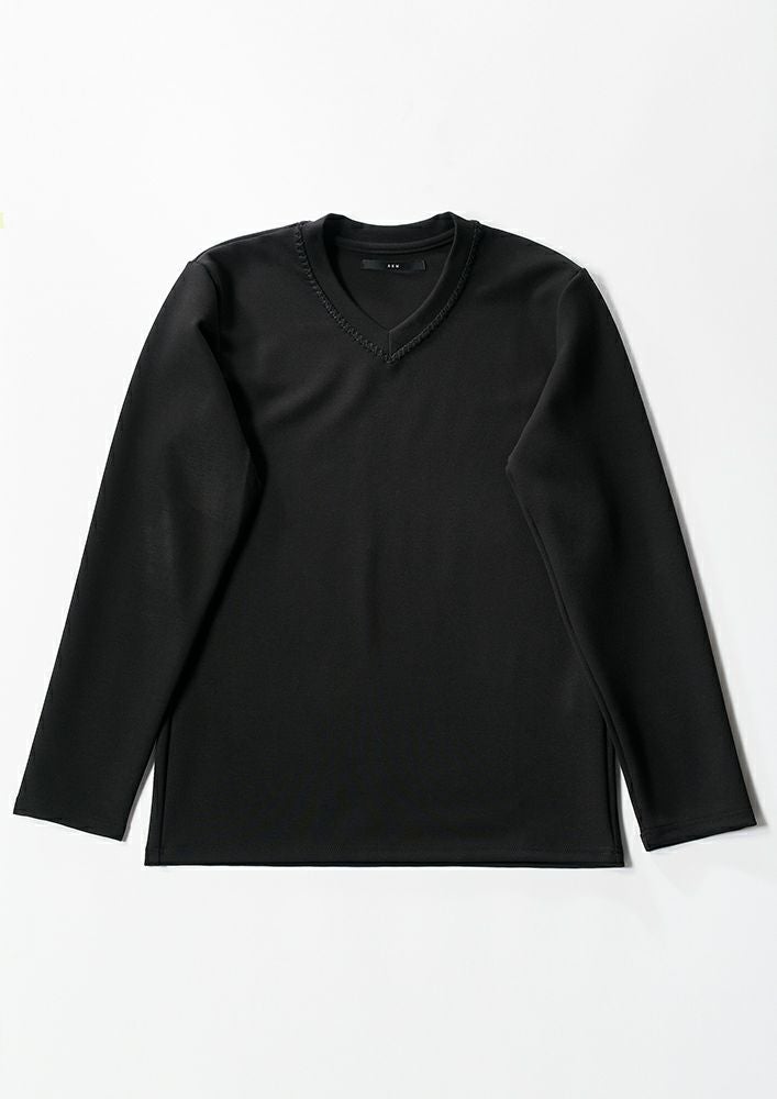 【 T243 / ALR026 / DUALWARM MOIST PONTI L/S HAND STITCH V-NECK -BLACK- 】