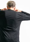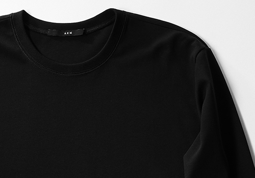 AKM定番のクルーネックの長袖Tシャツです。シンプルでベーシックなアイテムだからこそ、毎シーズン、身巾や衿の深さ、形状など改良を重ねています。衿と袖口はリブ(フライス)仕様です。