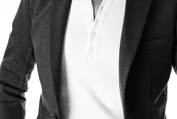 AKM ではV首に変形デザインして、首元の開きを広くすることでシャープな。