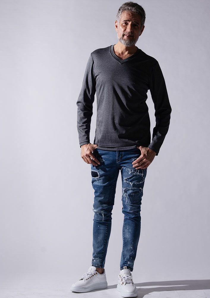 【AKM】L/S HAND STITCH V-NECK -D.GRAY-