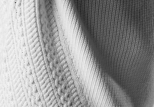 もう片側をタックを入れる編み方の片畦編みと天竺表目を交差する事で立体感を出す編み方の縄編みを