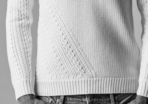 5G(ゲージ)の変則編み(片畦編み×縄編み)フィッシャーマンニットです。
