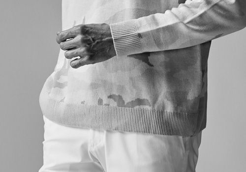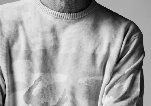 ダブルジャガードで編み立てる事で、AKMオリジナルのウッドランドカモ柄を表現しつつ、伸縮性がありしなやかな風合いに仕上げています。