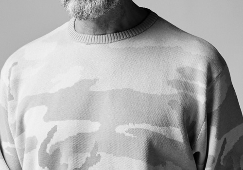 たっぷりとした身巾とドロップショルダーにすることでリラックスムード溢れる着こなしが可能です。同系色のカモフラ柄がAKMらしく、