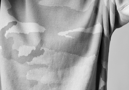 ダブルジャガードで編み立てる事で、AKMオリジナルのウッドランドカモ柄を表現しつつ、伸縮性がありしなやかな風合いに仕上げています。
