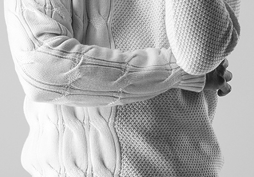 7G(ゲージ)の変則編み(縄編み×鹿の子ワッフル編み)クルーネックニットです。