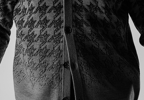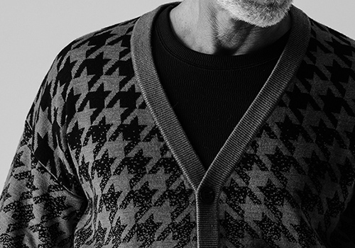 AKMオリジナルの千鳥柄グラデーションニットの登場です。ハッキリとした千鳥柄を裾に向かってグラデーションで徐々に薄くしています。ジャガード+減らし目の仕様が玄人好みで、適度な肉感で扱いやすいニットです。21AWではプルオーバーのクルーネックを発表しましたが、今季はVカーディガン型をご提案します。釦は本水牛六穴釦を採用。