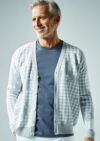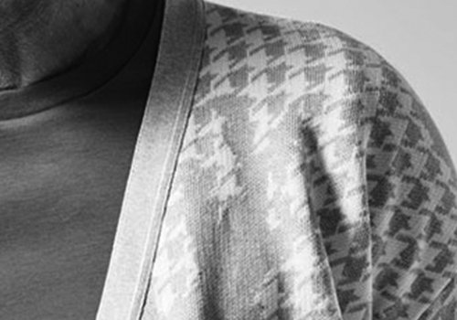 ダブルジャガードで編み立てる事で、AKMオリジナルの「千鳥カモ柄」を表現しつつ、 伸縮性がありしなやかな風合いに仕上げています。 尚、編地がしっかり上がり型崩れがしにくい編み組織となっております。