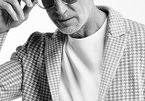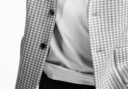 ダブルジャガード編みにて程よい大きさの千鳥格子総柄を表現し、ハリコシと適度な落ち感のある編地