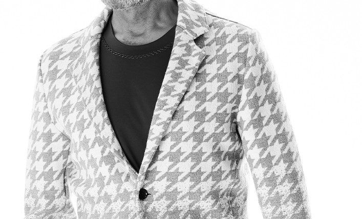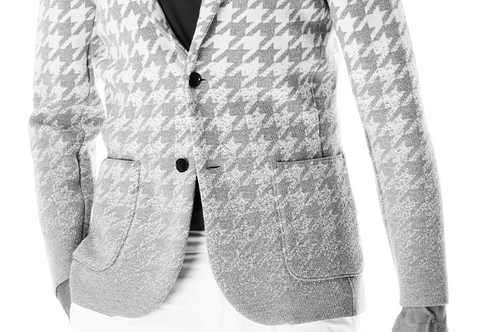 ダブルジャガード編みにて千鳥格子のグラデーション柄を表現し、ハリコシと適度な落ち感のある編地は秋冬に最適です。