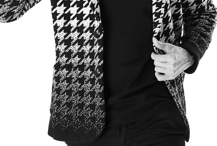 ダブルジャガード編みにて千鳥格子のグラデーション柄を表現し、ハリコシと適度な落ち感のある編地は秋冬に最適です。
