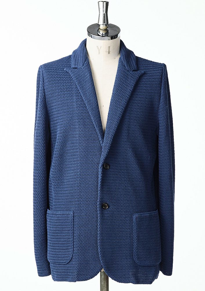 凹凸を際立たせた奇麗な印影とハリコシの有る安定したニット生地は春夏ジャケットを爽やかでありながら、しっかりしたシルエットに見せてくれます。