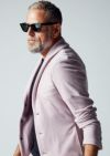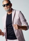 ショール衿の3釦ジャケットです。脇下の細腹をリブ使いし、