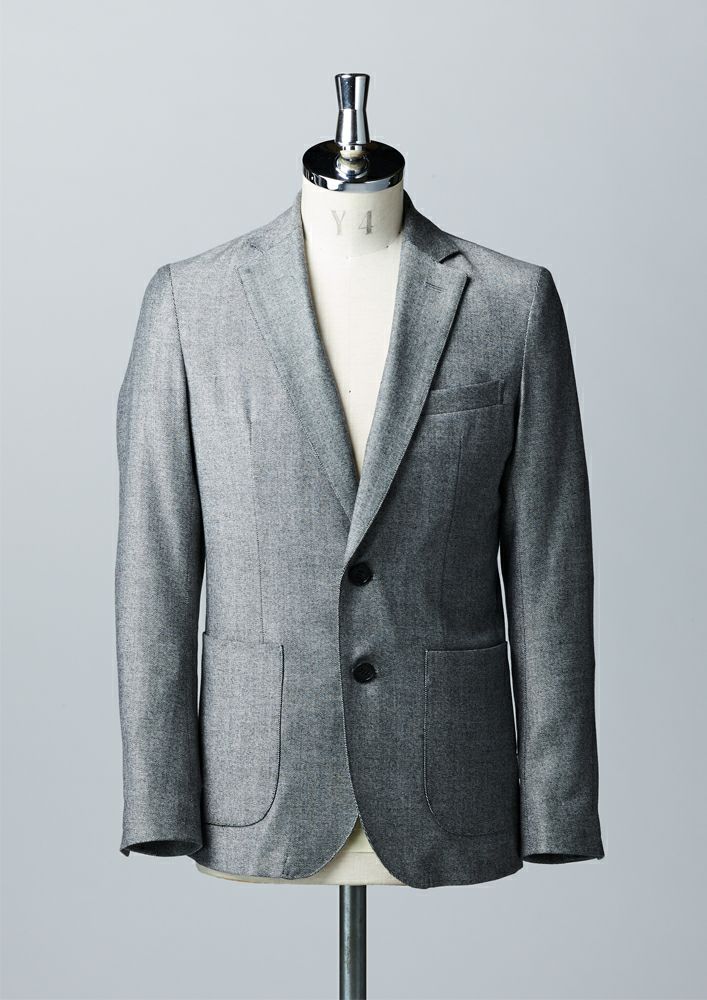 パッチポケットが特徴的なシングルノッチドラペルジャケットは総裏仕立てで身返しはお台場仕様とより