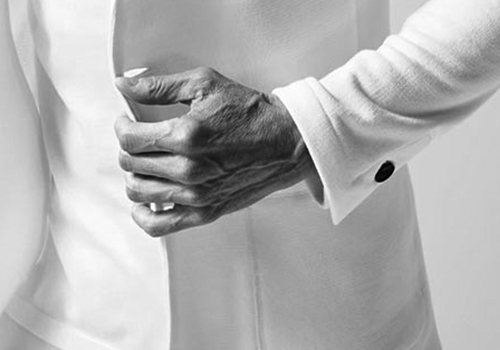 今季はラペル衿を若干細くしています。釦はAKMオリジナルの六穴水牛釦を採用しています。