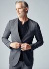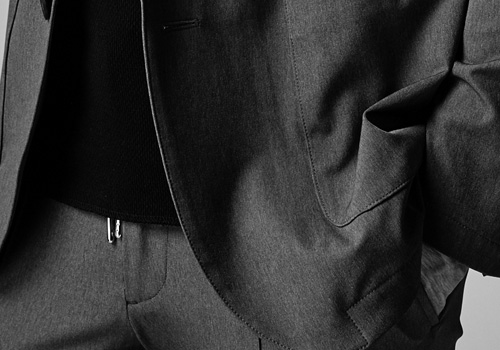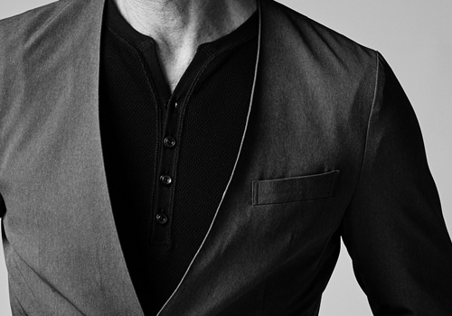 腰のパッチポケットが特徴的なAKM定番の2つ釦ジャケットの衿無し、ノーカラーverの登場です。釦はAKM定番の本水牛六穴釦です。