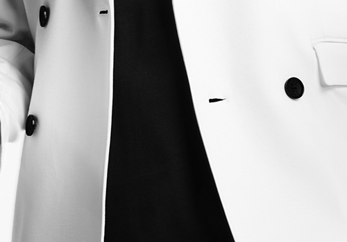 AKM秋冬定番のデュアルウォームSWING EASY SET-UP。今季は無地のみの展開で、フラップポケットが特徴的なダブルピークドラペルジャケットを新たにラインナップ。発熱効果のあるポンチ素材を採用し、一枚仕立てで軽量に仕上げながらもウォーム効果がある素材を採用することで、秋冬仕様へと昇華しています。ストレッチ性にも富んでいるので快適な着用感を保証します。釦は AKM 定番の本水牛六穴釦です。
