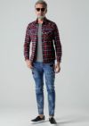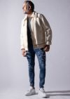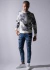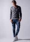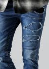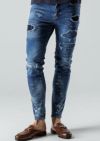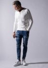 構築したデニムパンツです。スキニーフィッティングとテーパードしたシルエットがまさにタウンユースと言える仕上がりを見せています。今季はクラッシュ&リペア&パッチワークを施し、ホワイトはワンウォッシュ+立体ヒゲ、インディゴとブラックはアイスウォッシュ加工を施しました。また、熟練の職人によるペンキ加工を追加しています。後ポケットに付けているお馴染みのAKMロゴクリップが商品を引き締めています。