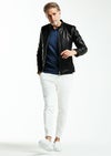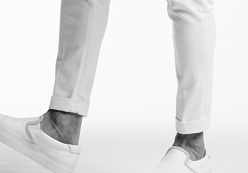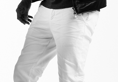 タイトフィットな”デニスラ”(デニムスラックス)の発表です。カジュアルの代名詞的なデニム素材をドレッシーなセンタープレス入りスラックスに落とし込みました。フロントはタック釦で、前開きはZIP 仕様です。後ポケットは釦を付けずに両玉縁ポケットにし、裾はダブルに仕上げています。今季は過度な加工は避け、ワンウォッシュ+立体ヒゲを施しています。ストレッチ性の高いハイパワーストレッチデニムは美しいシルエットを生み、着心地も抜群です。