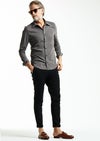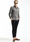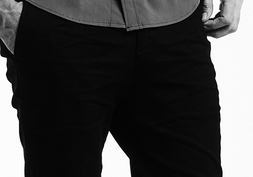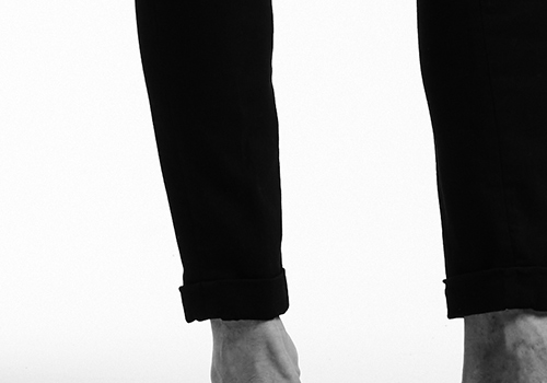 タイトフィットな”デニスラ”(デニムスラックス)の発表です。カジュアルの代名詞的なデニム素材をドレッシーなセンタープレス入りスラックスに落とし込みました。フロントはタック釦で、前開きはZIP 仕様です。後ポケットは釦を付けずに両玉縁ポケットにし、裾はダブルに仕上げています。今季は過度な加工は避け、ワンウォッシュ+立体ヒゲを施しています。ストレッチ性の高いハイパワーストレッチデニムは美しいシルエットを生み、着心地も抜群です。