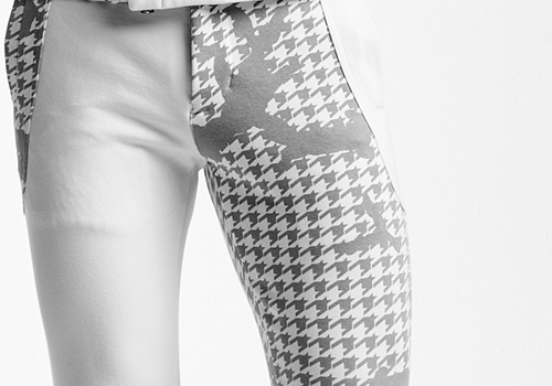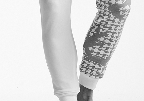 企画が始まって以来ずっと奈良の編み工場にて編み続けているこの生地は、その強力なストレッチのため染色加工の段階でかなりのシワが入ってしまうのを泉州の染色工場が何度も時間をかけて仕上げることでシワを伸ばし生地に仕上げています。 プリントもずっと泉州のプリント工場で加工しており、安定的なクオリティを保証します。今季は無地のホワイト、杢グレー、黒の3色、無地とAKMオリジナル千鳥カモ柄のクレイジー仕様にした2色 計4色展開です。