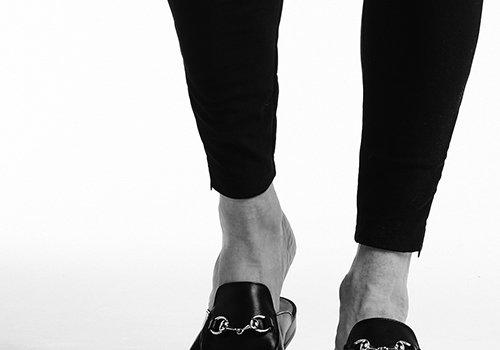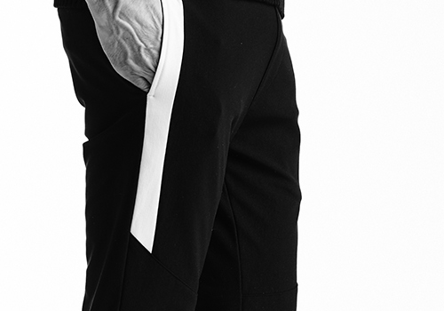足首を細く、足全体を美しく見せるべく誕生した美脚シルエットのAKM定番スキニーパンツの登場です。裾巾を極限まで細く設定していながらもコンシールファスナーを搭載することで着脱し易くしています。また、膝上の両脇にライン状の配色切替をし、デザインのアクセントにしています。
